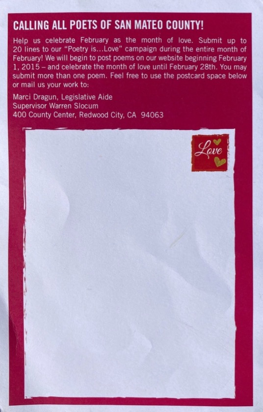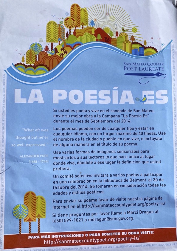 “My community project was to promote and judge county-wide poetry campaigns and contests, all organized around a theme and culminating in an event at a different venue. With support from Carole Groom’s office and staff, and Warren Slocum’s office and staff, we promoted each campaign throughout the county. Our first event was “Poetry Is” and California Poet Laureate Emeritus Al Young featured at the Belmont Library with Lakiba Pittman, Kalamu Chache, and the winners I selected from the different age groups: Youth, Teen, Adult. Thereafter, we promoted such themes as “Poetry is Heritage,” “Poetry is Autumn,” “Poetry is Nature,” “Poetry is Love,” and “Poetry is Family”. We held one event at the Fair Oaks Community Center, and featured Santa Clara PL David Perez for Poetry is Heritage.”