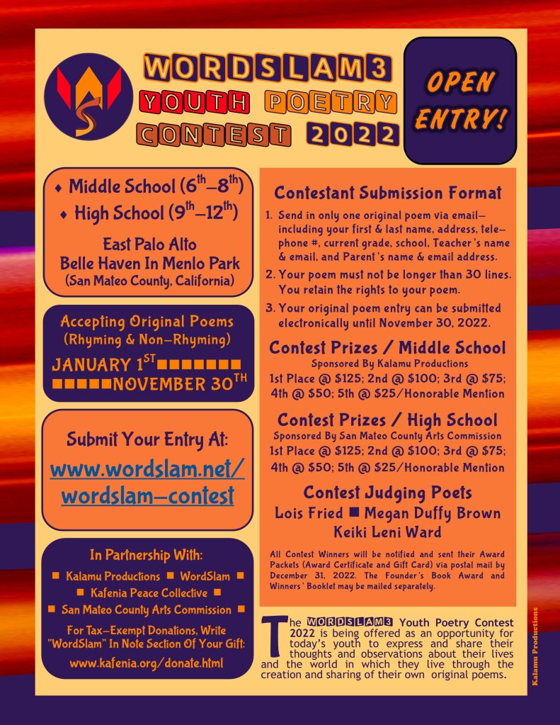 The Wordslam 3 Youth Poetry Contest launched by East Palo Alto Poet Laureate Kalamu Chache is now accepting submissions of original poems by middle school and high school students who live in East Palo Alto and the Belle Haven community of Menlo Park. Click here for more info.